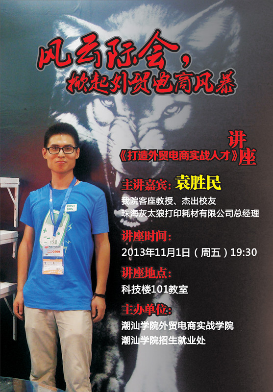 主讲嘉宾:袁胜民 我院客座教授、杰出校友 珠海灰太狼打印耗材有限公司总经理 讲座时间: 讲座地点:科技楼101教室 主办单位:潮汕学院外贸电商实战学院 潮汕学院招生就业处 ![]()