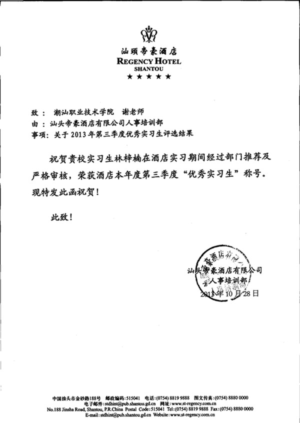 我系2012级林梓楠同学获得汕头帝豪酒店"优秀实习生"称号
