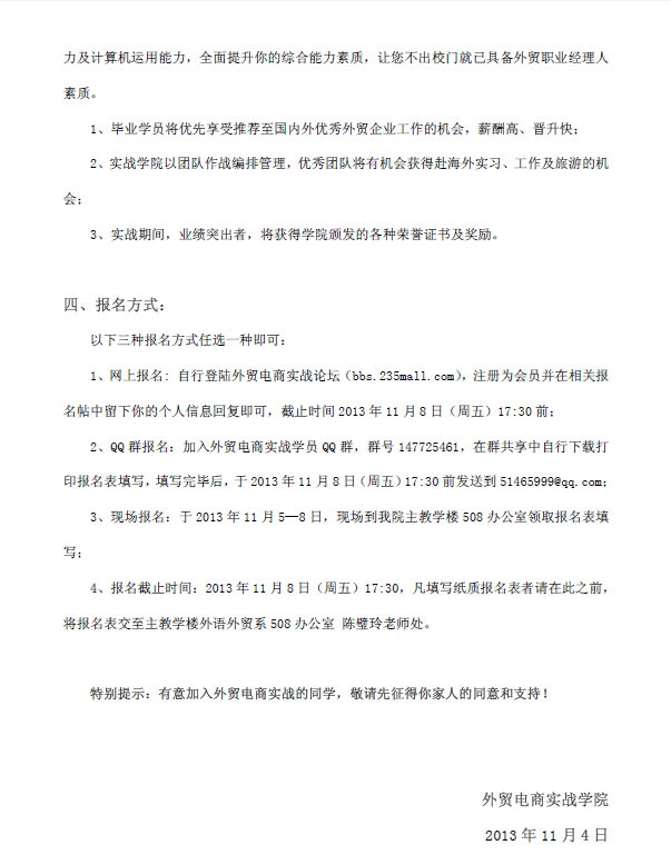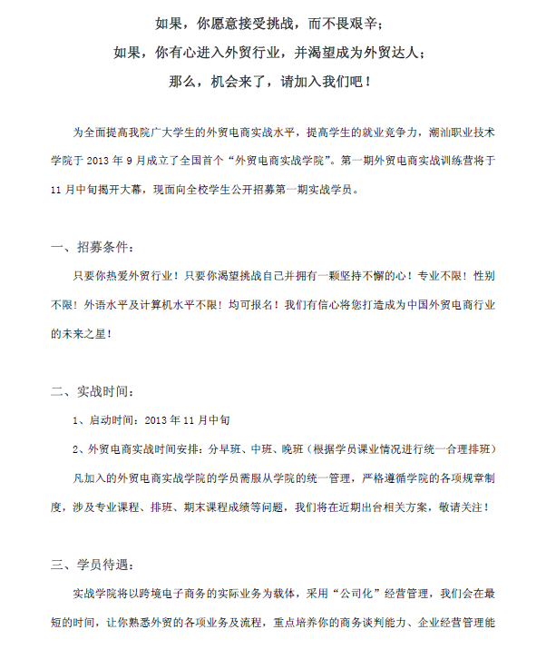 外贸电商实战学院首期学员招募启事 附件:招募 报名表 招募报名表