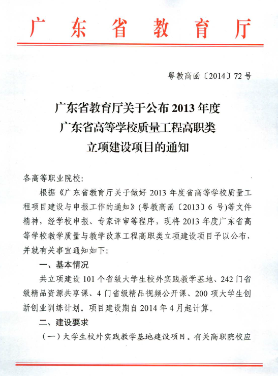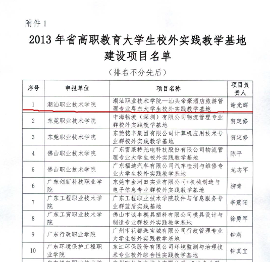 由外语外贸系综合教研室主任主持的“潮汕职业技术学院——汕头帝豪酒店粤东高校大学生实践教学基地”建设项目,2014年6月,经广东省教育厅批复,正式获得2013广东省高等学校质量工程高职类--实训基地立项项目,这是我系在实践教学改革中的又一重大突破。 该项目的总体目标是通过两年的建设,把“潮汕职业技术学院——汕头帝豪酒店粤东高校大学生实践教学基地”建设成为粤东高校旅游管理专业为主兼顾经管类专业的专业建设基地、实践教学基地、教师能力培养基地、人才培训基地、教育教学改革基地、产学研合作基地、科研成果转化基地、实践教学教材编写基地和社会服务基地的综合体,以便更好的发挥和完善基地的作用,创新校企合作人才培养模式的新机制。建设内容包含:1、校企双方共建专业,共育人才2、设立科学高效的管理机构,规范基地管3、健全实践教学管理制度,保障实践教学质量4、加强基地校企双方师资队伍建设,提高实践教学指导水平。 ![]() ![]() |