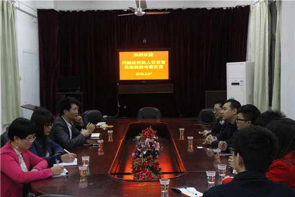 | 2016年2月27日,闪耀绘创始人贺宣智一行来我院考察交流,我院院长助理兼党政办主任李育华、跨境电商实战学院院长陈江生、跨境电商实战学院院长助理叶炳森等领导亲临接待。 会上,院长助理李育华介绍潮汕学院创办历程和办学成果,随后跨境电商实战学院院长陈江生向闪耀绘创始人贺宣智一行介绍潮汕学院跨境电商实战学院的概况、 创办历程、教育理念和办学特色等。 闪耀绘创始人贺宣智高度评价我院的创业精神和创业理念,把李克强总理“大众创业、万众创新”精神落到实处。