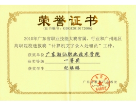 近日, 2010 年广东省职业技能大赛省属、行业和广州地区高职院校选拔赛揭晓:我院 09 模具班的纪焕鹏同学、 08 会计 2 班的崔志雄同学分别荣获计算机文字录入处理员工种一等奖和三等奖。 近年来,我院不断深化教学改革,尤其是加强计算机专业的实训操作,选拔骨干教师对...