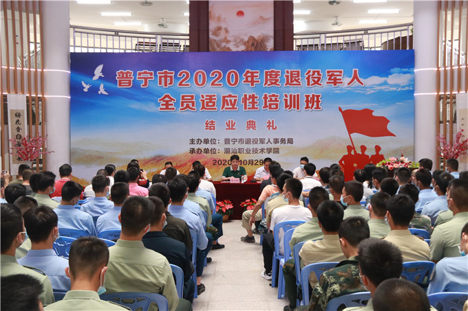 普宁市2020年度退役军人全员适应性培训班 结业典礼在我校隆重举行 10月29日,普宁市2020年度退役军人全员适应性培训班结业典礼在潮汕职业技术学院隆重举行。至此,为期五天的培训班圆满落下帷幕。结业典礼由普宁市退役军人事务局副局长黄山青主持。 出席结业典礼的领导: 普...