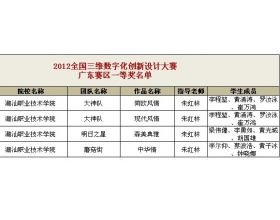 我院数字设计工程系师生参加2012全国三维数字化创新设计大赛再创佳绩 经过9个月的经过学校初赛、网络公示投票、作品资格审查、赛区复赛评审,由潮汕职业技术学院数字设计工程系朱红林老师、周书兴老师、吕旺虹老师、叶俊敏老师组队参加2012年第五届全国3D大赛赛区选拔(...