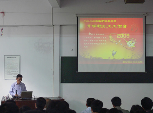 黄良君副院长首先在会上公布了人事调整并任命,接着总结了我院 2008-2009 学年第一学期的工作,他指出,上学期我院能深入贯彻党的“十七大”精神,践行科学发展观,把握国家大力发展职业技术教育的机遇,积极开展教育改革,加强教学管理,坚持以教学为中心,提高教育质量,推动内涵发展,积极探索管理方法和发展模式,取得了可喜的成绩。总结认为,学院领导能够带领全体教职工继续解放思想,开拓进取;通过完善教学质量监控体系,加强对教学工作的日常检查、督导、管理,有效提高了教学质量;通过精品课程建设、主题教研活动、多媒体课件比赛等活动活跃了教研教改气氛,促进了内涵发展;通过加大投入,改善了教学条件,增建多媒体教室、改建了语音室及新购图书一大批;加强学生工作,培养优良校风;通过艺术节等丰富多彩的校园文化活动,增强学院活力,建设校园文化;加强师资队伍建设,招聘高学历、高职称的教学骨干和学科带头人,解决教职工职称评审等问题; 加强安全宣传教育,落实安全措施,确保了校园的安全稳定。