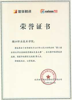 日前,世华财讯“第二届全国大学生金融投资模拟交易大赛”组委会对2007年10月29日-2008年1月19日(12个交易周)的大赛结果进行公布,我院经贸系金融与证券专业获得华南赛区团体第九名,全国第三十三名;2006级金融与证券专业梁月鹏同学获得期货项目的个人第二名,为学院赢得了荣誉。 为期80天的第二届全国大学生金融投资模拟交易大赛,共进行60个交易日,分为股票、期货、外汇、股指期货四大项目,吸引了全国近400所高校的60,000多名大学生参加。 我院经贸系组织金融与证券专业及其它相关专业学生近四十名,参加了此次比赛,同时经学院批准增加了相关的实训课程全力配合此次大赛,在师生一致努力下取得了优异的成绩。
