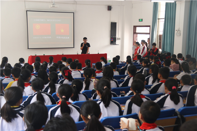 学工第三党支部书记陈金辉同志用“我会写故事”的小游戏带动会场气氛,以生动活泼的形式带领少先队员们认识国旗、党旗、团旗、队旗和国歌,让少先队员们了解党团历史。