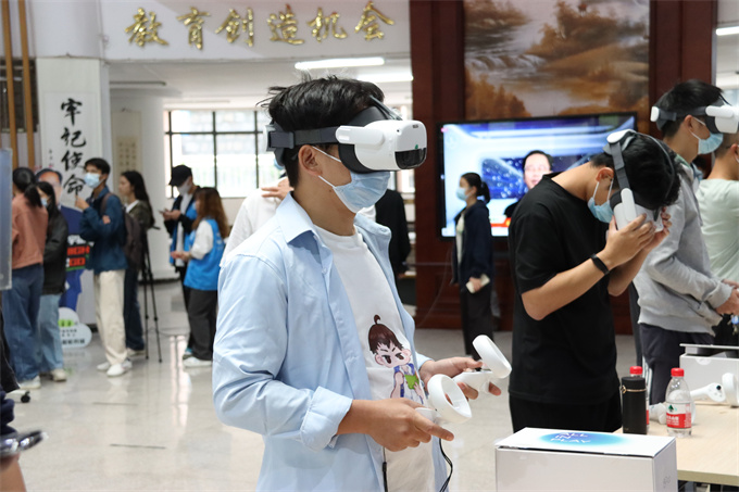 现场十分热闹,许多师生沉浸在各种各样的元宇宙空间,体验由科技赋予的全新世界,有的在游览井冈山革命博物馆,有的在游览张家界旅游风景区,有的在沉浸式观看CBA篮球比赛,有的在通过巨幕抖音看二十大实况,有的在沉浸式零距离观看直播,有的在影院观看巨幕电影……