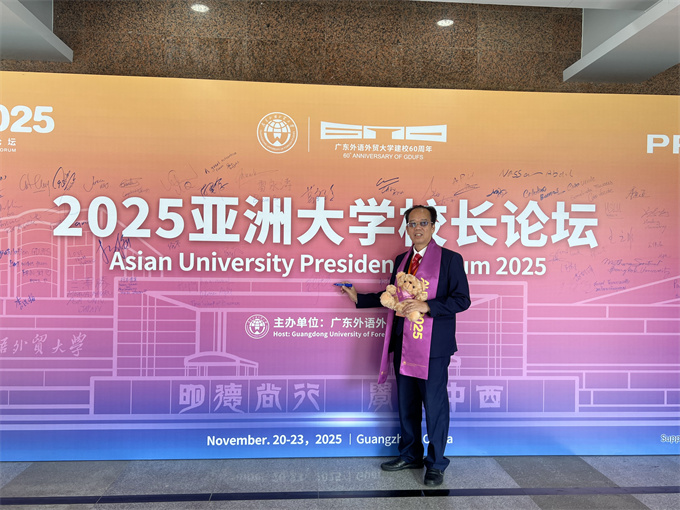我校代表团出席2025亚洲大学校长论坛11月20日至22日,2025亚洲大学校长论坛在中国·广东广州广东外语外贸大学白云山校区隆重召开。本届论坛由广东外语外贸大学主办,论坛以“新技术与跨部门协同:开创亚洲高等教育韧性与包容性增长的新路径”为主题。吸引了来自31个国家和地区的近90所高校及机构、200多名代表,以及15个国家驻广州总领事馆代表齐聚一堂。潮汕职业技术学院作为论坛四个发起院校之一,董事长纪少游先生受邀出席,创业学院院长助理林少华、对外交流教师陈树志陪同。 ![]() 2025亚洲大学校长论坛合影 ![]() 潮汕职业技术学院董事长纪少游先生 出席2025亚洲大学校长论坛