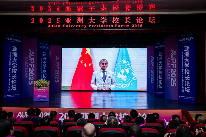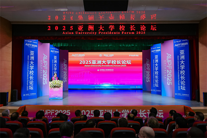 论坛开幕仪式于11月21日上午在广东外语外贸大学白云山校区明德报告厅隆重举行。广东外语外贸大学党委书记石佑启教授致欢迎辞,强调论坛主题呼应全球教育变革趋势,倡议亚洲高校凝聚创新合力,推动教育协同发展。 ![]() 2025亚洲大学校长论坛开幕仪式由 广东外语外贸大学副校长申明浩教授主持 ![]() 2025亚洲大学校长论坛开幕式现场 ![]() 广东外语外贸大学党委书记石佑启教授致欢迎辞