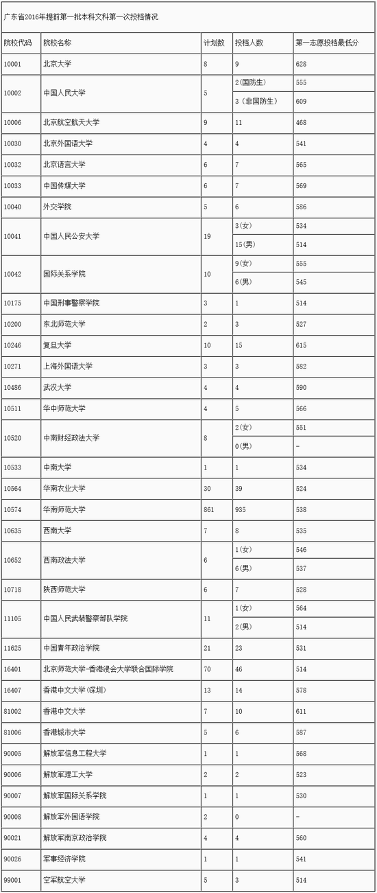 广东提前批一本第一志愿投档人数和投档分(文)