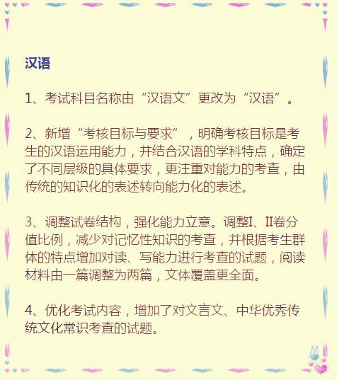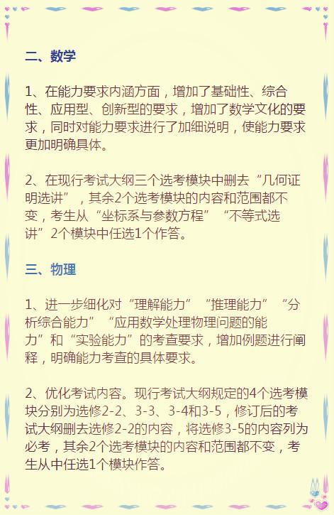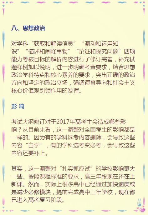 教育部考试中心说,此次考试大纲修订是为了“推进改革创新,优化考试内容,着力提高质量,提前谋篇布局,体现素养导向……” 其实,就是要体现课程改革理念,为实现2020年新高考改革目标做准备。 因此,这份高考大纲影响的不止是高三学生,还有所有的中学生们。 地球上的高考生们都知道,考试大纲是高考命题的规范性文件和标准,是考试评价、复习备考的依据,是推进考试内容改革的切入点。 ![]() ![]() ![]() ![]() 来看看教育部考试中心对八门学科具体修订了哪些内容: ![]() ![]() ![]() ![]() ![]() ![]()