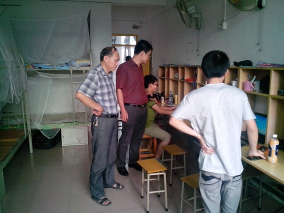 2013年10月16日下午4点;潮汕学院中职部副主任吴容震、主任助理孙锐杰同各年级辅导员对我中职部宿舍进行了全面的检查。