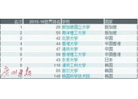 英国教育杂志《泰晤士报高等教育》20日公布了2016年亚洲大学排行榜。新加坡国立大学拔得头筹,新加坡南洋理工大学和北京大学并列第二名,香港大学和清华大学分别位列第四和第五名。...