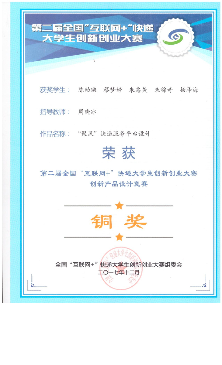 | 2017年12月8日第二届全国“互联网+”快递大学生创新创业大赛全国第二轮总决赛已经结束,潮汕学院““聚风”快递服务平台设计”作品获得铜奖。