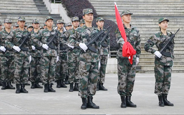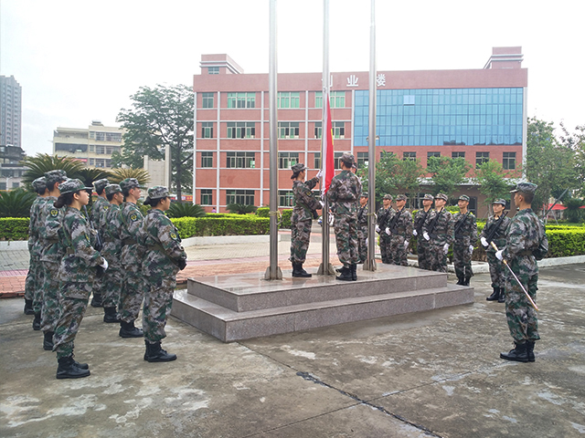 国旗护卫队迈着整齐坚定的步伐向升旗台走去严肃的神情坚挺的身姿展示出潮院学子不凡的气质