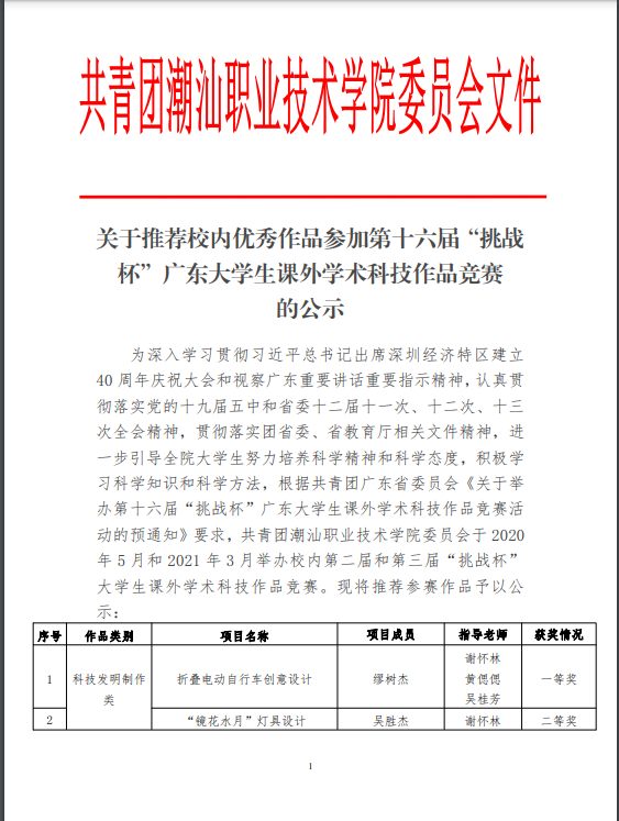 关于推荐校内优秀作品参加第十六届“挑战杯”广东大学生课外学术科技作品竞赛的公示