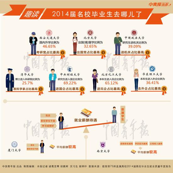 ![]() ![]() 近日,教育部75所直属高校陆续发布了2014届高校毕业生就业质量年度报告(以下称“年报”)。中国青年报记者通过统计发现了一些有趣的结论:学校所在地成大学生就业首选城市;国有企业仍占主流,但民营企业势头已起来;学生干部和专业成绩好都可能成为获得高薪的要素。 学校所在地成大学生就业首选城市 在教育部75所直属高校中,明确披露毕业生就业地的有69所。中国青年报记者统计这69份年报时发现,这些高校毕业生的就业首选城市,并非某个具体意义上的城市,而是每一个学校的所在地。 比如,北京大学毕业生在北京签约的比例,即人们通常所说的留京率,达到了56.15%,位列第一。中国人民大学留京率达52.67%,北京化工大学留京率达42.9%,北京交通大学留京率也达37.74%。相应地,北京也就成了这几所学校中毕业生签约比例最高的城市。 这不是北京高校特有的现象。复旦大学毕业生就业地区主要集中在长三角地区,其中,在上海市就业人数共3107人,占毕业生总数的75.73%。南开大学毕业生在天津市的就业比重最高,其中本科生占比为52.24%,研究生为51.77%。大连理工大学本科生、研究生留在大连市的比例也最高,分别为24.59%、20.43%。 中西部高校也是如此。如中国地质大学(武汉)毕业生在湖北省的就业比重达30.47%,合肥工业大学在安徽省的就业比例有31.11%,四川大学留川工作的毕业生,占该校就业总人数的近一半,被媒体称之为“川才川用”。 除了学校所在地外,毕业生签约率最高的城市分别是北京、上海、广州和深圳。 值得注意的是,受国家支持中西部发展政策的影响,东部高校毕业生前往中西部就业的比例也不低。比如,清华大学毕业生去中部、西部就业的比例,就分别达到了6.2%和10.3%。华北电力大学的比例更高,本科毕业生去西部的为18%,研究生去西部的为15.7%。 不过,相比实际的签约情况,不少学生从意愿上更倾向于留在东部。根据北京大学关于毕业生期望就业地域的统计,希望前去西部就业的比例为4.78%,去中部比例仅为2.39%,这两者远低于实际签约比例2~3%。而对于北京、上海,他们期待的比例则达到70.22%,8.60%,也高于实际的56.15%和8.14%。 国有企业仍占主流,但民企已有起势 年报里的就业,不仅包括人们通常意义上所说的签订劳动合同,也包括升学、出国出境、定向委培、灵活就业、自主创业等形式。 值得注意是,在75所教育部直属高校的年报中,985高校本科生的升学率(即通俗所说的考研(课程)和保研的比例)基本在30%以上,有的还高达40%以上。比如,西安交通大学升学率为46.65%,北京大学升学率达到46.4%。但与211高校和普通高校相比,这一比例却参差不齐:有的维持在20%以上,也有低至20%的。 从签约单位的性质来看毕业生的走向,三资(外)企业的香饽饽时代早已一去不复返,其中,985高校毕业生签约三资企业的比例基本上都在10%以下,有的还停留在5%以下,比如中国人民大学研究生签约三资企业比例是4.87%,北京师范大学本科生签约三资企业的仅有1.79%。 取而代之的是国有企业和民营企业。但两者比例孰高孰低,在不同学校却表现不同,并没有一个共性的比例。 仅以教育部直属的985高校为例,有些高校的毕业生,签约国企的比例牢牢占据了最大比重的位置。比如大连理工大学本科毕业生进入国企的有32.11%,东北大学本科毕业生的这一比例为48.6%,其研究生的比例更高,为52.7%。 在另一些学校,两者的比例却是不分伯仲。比如,西安交通大学研究生毕业生进入民企的比例为28.79%,进入国企的则为28.16%。而中山大学42.92%的本科毕业生签约民企,远超其签约国企24.42%的比例。 不过,两者的发展走势,却有一个相对明晰的趋向。正如东北大学年报里所描述那样,“国有企业仍占主流,但民营企业势头已起来”。 中国青年报记者发现,与75所教育部直属高校2013届大学生就业质量报告相比,在2014届毕业生就业年报中,国企签约比例下降,民企签约比例上升的趋势在一些高校十分明显。 比如北京大学,该校2013年本科生进入国企的比例为25.26%,进入民企的为13.89%,而今年,前者降至14.57%,后者则升至41.52%。 这一点和专业教育数据公司麦可思的数据一致,根据该机构所做的《中国大学生就业报告》(就业蓝皮书),过去连续4年大学毕业生半年后的就业数据(2009届至2013届),外企就业比例下降了4%,国企的下降了2%,民企的则上升4%。其中,民营企业就业增长较快的行业是健康,制造业和建筑类。麦可思创始人王伯庆说,受经济增长减速和就业观念的影响,变化较大的可能会发生在最近一年。 学生干部和专业成绩好都可能成为高薪要素 不管是哪种单位会成为未来的就业高地,对大学生而言,更值得关心的是如何能找到一份较为理想的工作。中国青年报记者梳理发现,不少高校报告提及用人单位最看重的,是个人实际能力(专业能力)。 北京大学委托第三方机构调查发现,用人单位对毕业生个人能力、道德修养及面试表现等较为重视。中国石油大学(北京)的年报显示,用人单位更看重毕业生的个人实际能力、所学专业对口程度。在华中科技大学年报中,涉及到的用人单位最看重应聘人员的能力排序中,专业基础也居第一位。 不仅用人单位这么看,毕业生自我评估也验证了这一点。在浙江大学毕业生眼里,毕业生的核心竞争力排名第一的就是专业能力。 也有的讲究“专业对口”。湖南大学用人单位对毕业