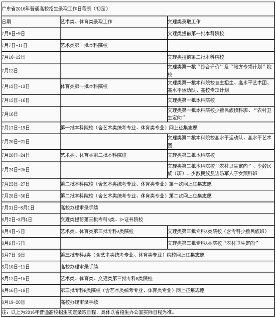 2016年广东高考各批次招生录取时间为7月6日-8月20日,具体安排如下。