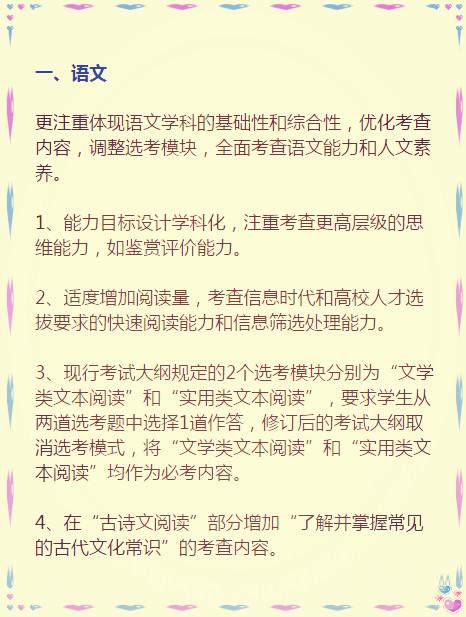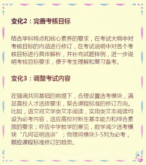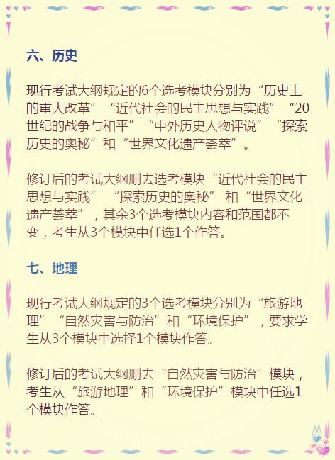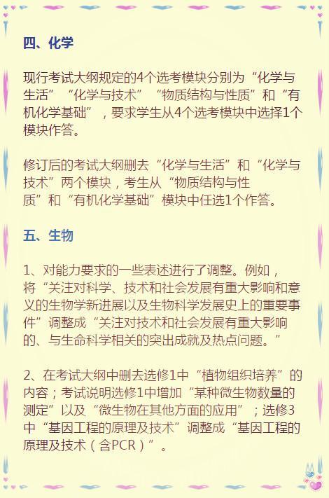 教育部考试中心说,此次考试大纲修订是为了“推进改革创新,优化考试内容,着力提高质量,提前谋篇布局,体现素养导向……” 其实,就是要体现课程改革理念,为实现2020年新高考改革目标做准备。 因此,这份高考大纲影响的不止是高三学生,还有所有的中学生们。 地球上的高考生们都知道,考试大纲是高考命题的规范性文件和标准,是考试评价、复习备考的依据,是推进考试内容改革的切入点。 ![]() ![]() ![]() ![]() 来看看教育部考试中心对八门学科具体修订了哪些内容: ![]() ![]() ![]() ![]() ![]() ![]()
