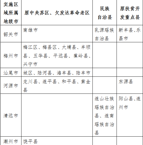 为贯彻落实《国务院关于深化考试招生制度改革的实施意见》和《政府工作报告》有关部署,2017年继续实施重点高校招收农村和贫困地区学生的国家专项计划、地方专项计划和高校专项计划(以下统称为专项计划)。现将有关工作通知如下: 一、明确报考条件 1.国家专项计划定向招收贫困地区学生。招生学校为中央部门高校和各省(区、市)所属重点高校,2017年安排招生计划6.3万名。实施区域为集中连片特殊困难县、国家级扶贫开发重点县以及新疆南疆四地州。报考学生须同时具备下列三项条件:(1)符合2017年统一高考报名条件;(2)本人具有实施区域当地连续3年以上户籍,其父亲或母亲或法定监护人具有当地户籍;(3)本人具有户籍所在县高中连续3年学籍并实际就读。 2.地方专项计划定向招收各省(区、市)实施区域的农村学生。招生学校为各省(区、市)所属重点高校, 2017年安排招生计划原则上比2016年增加10%以上。具体实施区域、报考条件由各省(区、市)根据本地实际情况确定,实施区域要对本省(区、市)民族自治县实现全覆盖。 3.高校专项计划主要招收边远、贫困、民族等地区县(含县级市)以下高中勤奋好学、成绩优良的农村学生。招生学校为教育部直属高校和其他自主招生试点高校,2017年安排招生计划不少于有关高校年度本科招生规模的2%。具体实施区域由有关省(区、市)确定。报考学生须同时具备下列三项条件:(1)符合2017年统一高考报名条件;(2)本人及父亲或母亲或法定监护人户籍地在实施区域的农村,本人具有当地连续3年以上户籍;(3)本人具有户籍所在县高中连续3年学籍并实际就读。 根据中央有关部署,国家专项计划实施区域的贫困县脱贫后2017年仍可继续享受国家专项计划政策。有关省(区、市)要严格执行国家专项计划确定的实施区域,不得擅自扩大范围。地方专项计划和高校专项计划实施区域由有关省(区、市)根据文件要求,结合本地实际情况确定。有关省级招生考试机构须将本省(区、市)确定的高校专项计划实施区域提供给有关高校。各省(区、市)可根据上述报考条件要求,制订具体报名实施细则。 广东省2017年重点高校招收农村和贫困地区学生实施区域