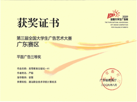 2009年“第三届全国大学生广告艺术大赛广东赛区颁奖典礼暨交流总结会”于10月24日下午在广东轻工职业技术学院隆重举行。我院计算机系2007级电脑艺术设计专业严聪同学参加第三届全国大学生广告艺术大赛,在曾繁老师指导下,以《高等教育出版社—VI》为选...