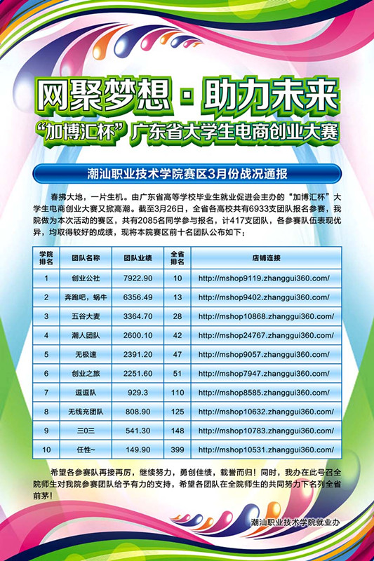 12月22日,潮汕学院第二届电子商务创业大赛表彰活动在普宁国际服装城举行,出席今天活动的有潮汕学院领导、中国普宁国际服装城领导,赞助本次大赛的企业领导,以及潮汕学院创业学院的全体师生。...