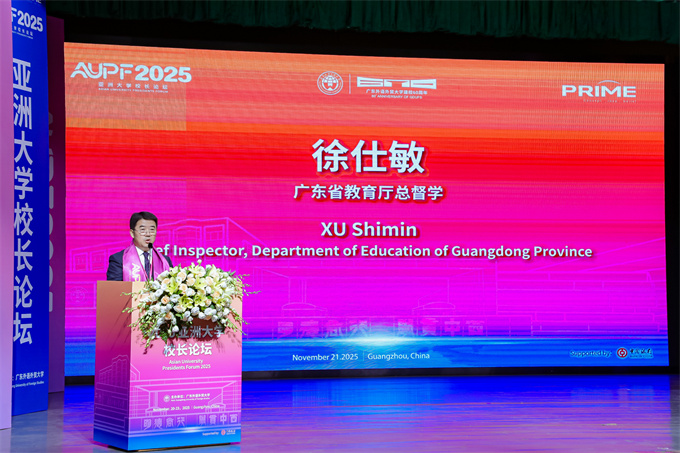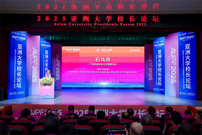 论坛开幕仪式于11月21日上午在广东外语外贸大学白云山校区明德报告厅隆重举行。广东外语外贸大学党委书记石佑启教授致欢迎辞,强调论坛主题呼应全球教育变革趋势,倡议亚洲高校凝聚创新合力,推动教育协同发展。 ![]() 2025亚洲大学校长论坛开幕仪式由 广东外语外贸大学副校长申明浩教授主持 ![]() 2025亚洲大学校长论坛开幕式现场 ![]() 广东外语外贸大学党委书记石佑启教授致欢迎辞