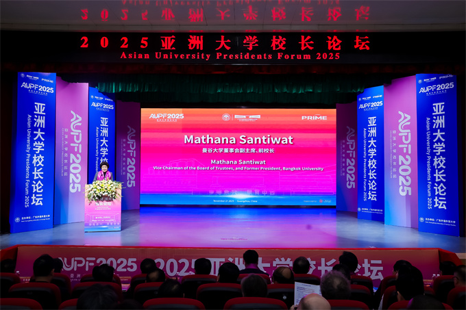 亚洲大学校长论坛常委单位代表、泰国曼谷大学董事会副主席玛莎娜女士在开幕式上表示,亚洲大学校长论坛自2002年由中泰高校发起后,已成为亚洲高校重要合作平台。她代表亚洲大学校长论坛常务委员会感谢广东外语外贸大学作为论坛秘书处的长期贡献,愿该论坛今后规模和影响不断扩大。 ![]() 泰国曼谷大学董事会副主席玛莎娜女士致辞