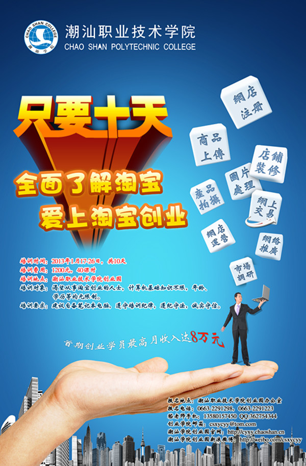 比尔·盖茨说过:21世纪要么电子商务,要么无商可务! 您想坐拥一个投资少、见效快的财富源泉——网店吗? 潮汕学院创业园首期创业学员最高月收入达8万元,你还在等什么? 网上已掀起一股又一股的网络淘金热潮,越来越多的人开始参与淘宝运营,“双十一”天猫淘宝交易额达191亿元,你是否是其中一员?为帮助您实现从事电子商务创业活动的愿望,潮汕职业技术学院创业园特举办淘宝创业培训班,手把手教会您注册网店、数据包制作管理、上传商品、网店装修、图片处理、产品拍摄、网上交易、网络推广、网店运营,进行市场调研、创业经验分享,等等。只要10天,让您全面了解淘宝创业,爱上淘宝创业。 培训对象:渴望从事淘宝创业的人士,计算机基础知识、年龄、学历不限。 培训时间:10天,2013年1月17-26日,40课时,上午理论授课,下午实战演练。 培训费用:1200元,(食宿自理,可住学院学生宿舍或招待所)。 培训地点:潮汕职业技术学院创业园 报名地点:潮汕职业技术学院创业园办公室 报名电话:0663-2291298,0663-2291223 嵇老师手机:13580157450 QQ:362754344 创业学院邮箱:csxycyy@tom.com 潮汕学院创业园官网:http://cyxy.chaoshan.cn 潮汕学院创业园新浪微博:http://weibo.com/csxycyy 培训要求:建议自备笔记本电脑,遵守培训纪律,遵纪守法,诚实守信。 潮汕职业技术学院创业园拥有雄厚的师资力量,丰富的教学经验,培育的首批淘宝创业班级,人均月收入达万元,单店月收入最高达8万元,是淘宝创业入门教育最理想的平台,愿与您携手共创美好明天! 淘宝创业培训教学安排