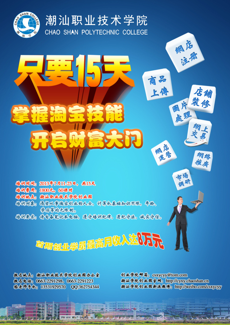 比尔·盖茨说过:21世纪要么电子商务,要么无商可务! 您想坐拥一个投资少、见效快的财富源泉——网店吗? 潮汕学院创业园首期创业学员最高月收入达8万元,你还在等什么? 网上已掀起一股又一股的网络淘金热潮,越来越多的人开始参与淘宝运营,“双十一”天猫淘宝交易额达191亿元,你是否是其中一员?为帮助您实现从事电子商务创业活动的愿望,潮汕职业技术学院创业园特举办淘宝创业培训班,手把手教会您注册网店、数据包制作管理、上传商品、网店装修、图片处理、产品拍摄、网上交易、网络推广、网店运营,进行市场调研、创业经验分享,等等。只要15天,让您全面掌握淘宝技能,开启财富大门。 培训对象:渴望从事淘宝创业的人士,计算机基础知识、年龄、学历不限。 培训时间:15天,2013年7月11-25日,60课时,上午理论授课,下午实战演练。 培训费用:1800元,(食宿自理,可住学院学生宿舍或招待所)。 培训地点:潮汕职业技术学院创业园 报名地点:潮汕职业技术学院创业园办公室 报名电话:0663-2291298,0663-2291223 嵇老师手机:13531929570 QQ:362754344 创业学院邮箱:csxycyy@tom.com 潮汕学院创业园官网:http://cyxy.chaoshan.cn 潮汕学院创业园新浪微博:http://weibo.com/csxycyy 培训要求:建议自备笔记本电脑,遵守培训纪律,遵纪守法,诚实守信。 参加培训的朋友请点击:潮汕学院创业学院淘宝创业培训学员报名表 潮汕职业技术学院创业园拥有雄厚的师资力量,丰富的教学经验,培育的首批淘宝创业班级,人均月收入达万元,单店月收入最高达8万元,是淘宝创业入门教育最理想的平台,愿与您携手共创美好明天! ![]() |