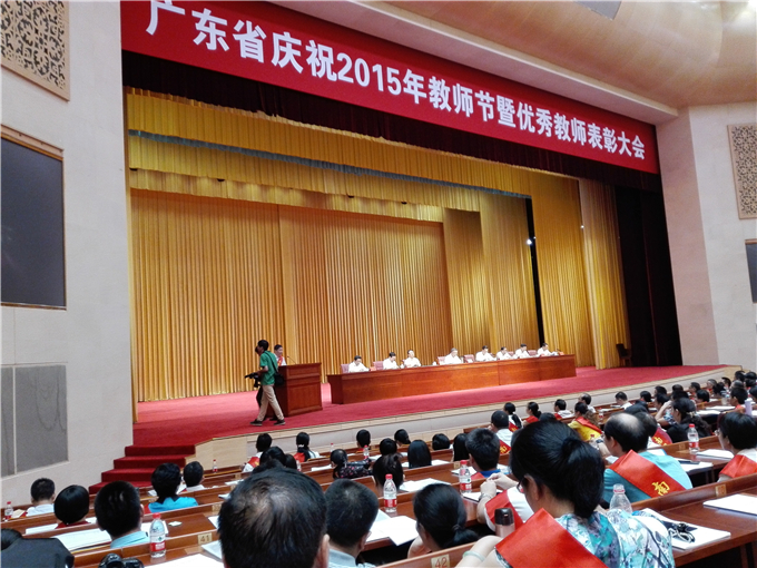 | 8日下午,广东省委、省政府在广州召开广东省庆祝2015年教师节暨优秀教师表彰大会。中共中央政治局委员、省委书记胡春华,省委副书记、省长朱小丹,省委常委、秘书长林木声,省人大常委会副主任周天鸿,副省长陈云贤,省政协副主席姚志彬等出席大会并为受表彰的南粤优秀教师、南粤优秀教育工作者代表颁奖。朱小丹在会上讲话,陈云贤主持会议。