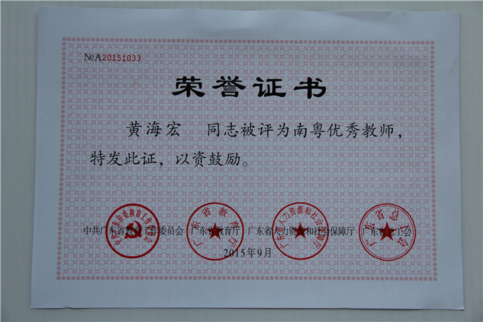 我院黄海宏老师喜获广东省“南粤优秀教师”称号